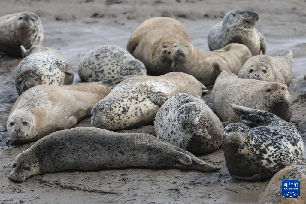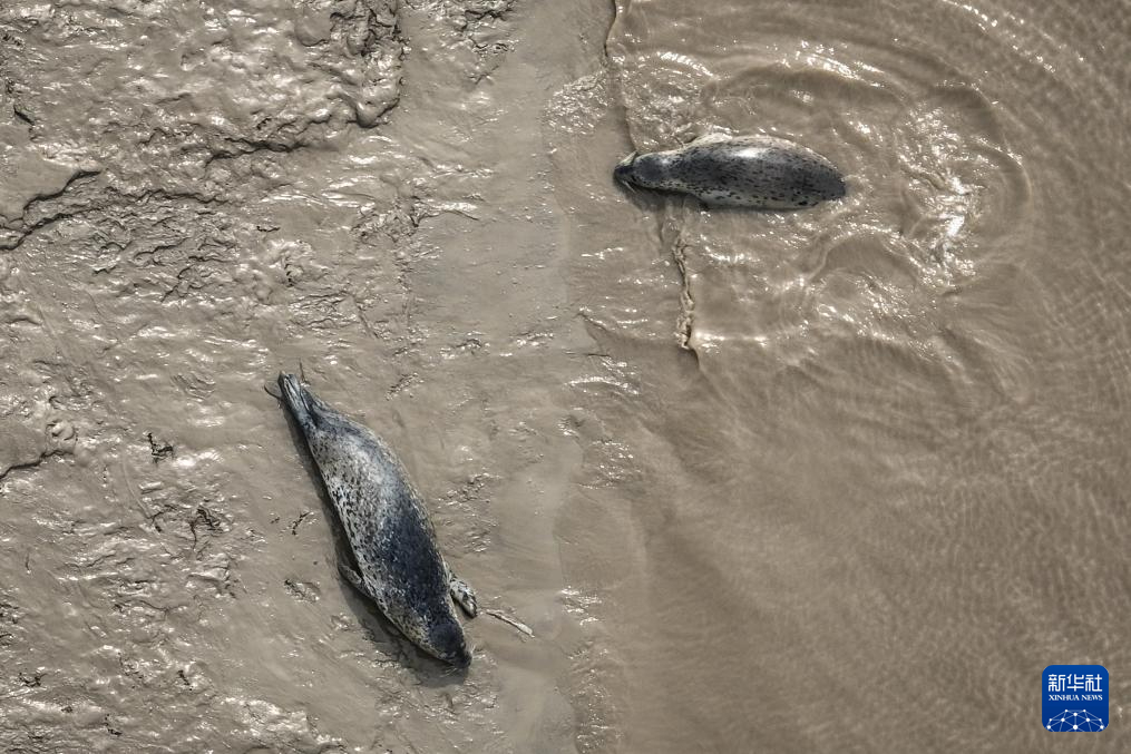 4月9日,西太平洋斑海豹在辽宁盘锦三道沟海域的滩涂上休息。新华社记者 潘昱龙 摄