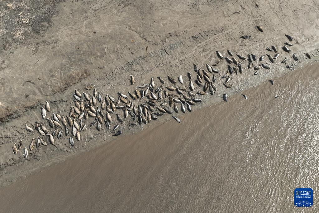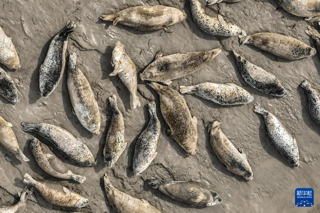 4月9日,西太平洋斑海豹在辽宁盘锦三道沟海域的滩涂上休息(无人机照片)。新华社记者 潘昱龙 摄