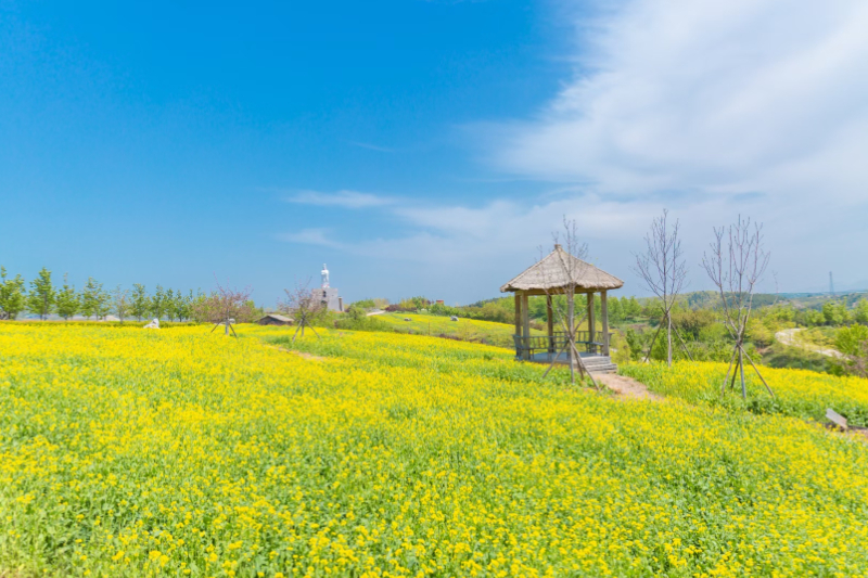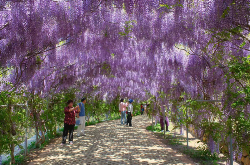 微风拂过,紫藤花随风飘荡。漫步在千米长的紫藤长廊下,仿佛置身于梦幻般的紫色世界。据介绍,这份“紫色浪漫”将持续至5月中下旬。离紫藤长廊不远处的油菜花田内,油菜花花开正艳,灿烂夺目,形成一片金灿灿的花海。