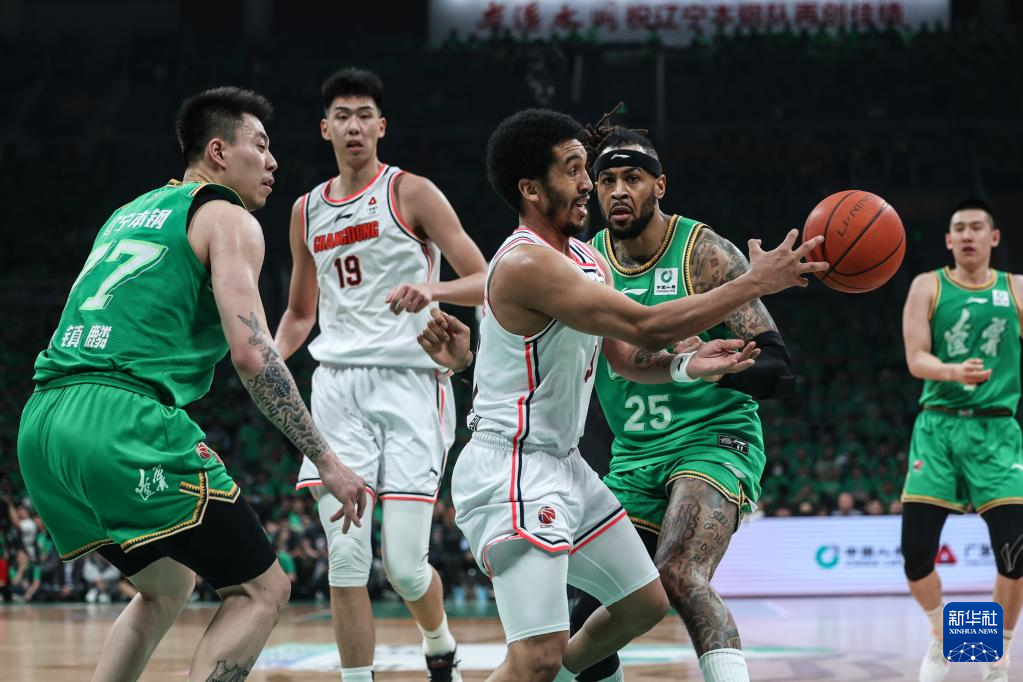 5月11日,广东华南虎队球员沃特斯(左三)在比赛中传球。新华社记者 潘昱龙 摄