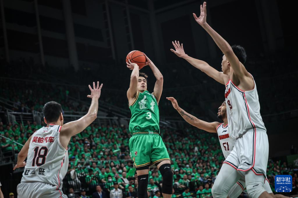 5月11日,辽宁本钢队球员赵继伟(左二)在比赛中投篮。新华社记者 潘昱龙 摄