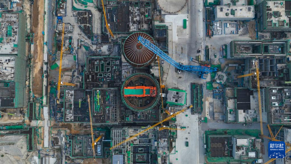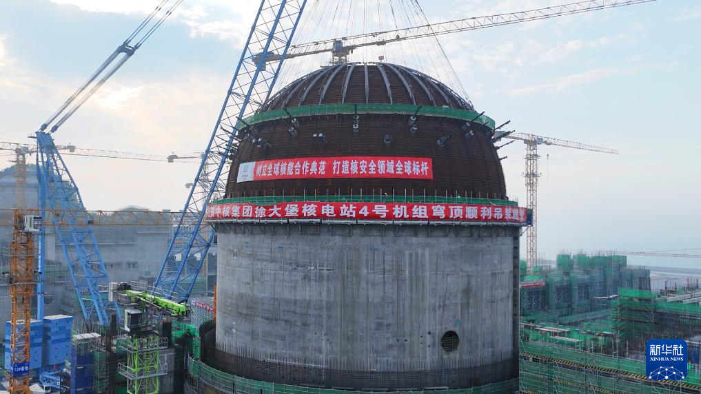 6月18日拍摄的徐大堡核电站4号机组穹顶吊装作业现场(无人机照片)。新华社发