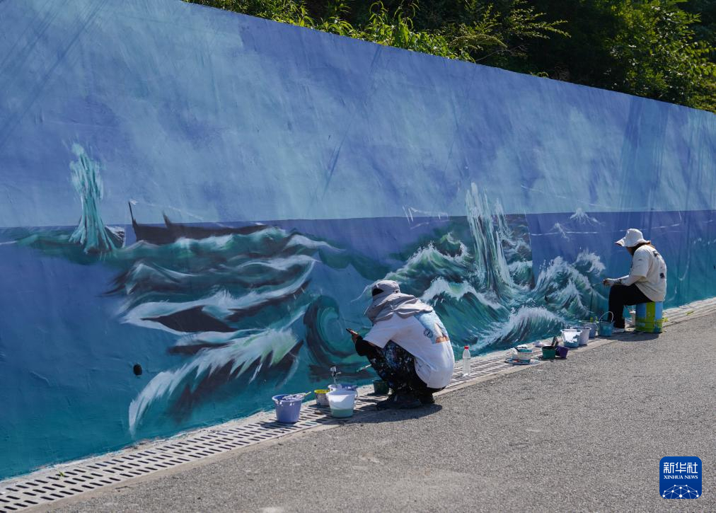 6月17日,工作人员在丹东大鹿岛进行墙体彩绘。新华社记者 樊雨晴 摄pagebreak