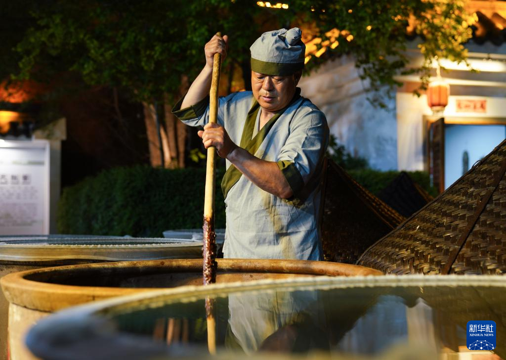 6月12日,在位于营口老街的营口大酱园内,工作人员展示大酱制作工艺。新华社记者 樊雨晴 摄pagebreak