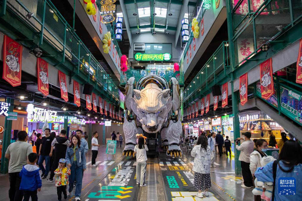 5月25日,游客在大连熊洞街参观仿生机械巨熊。新华社记者 李旭伦 摄