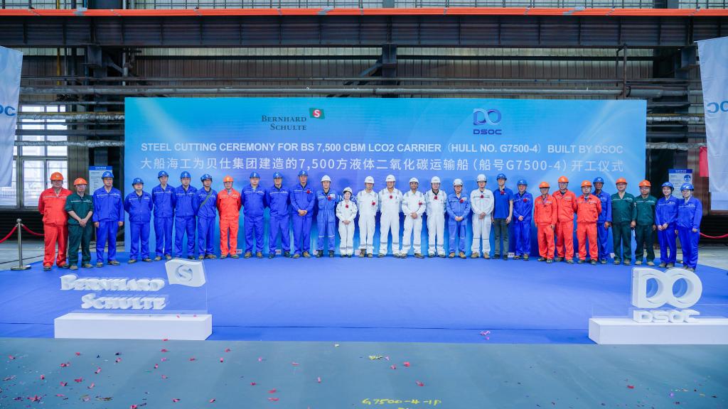郭超公司新开工的是一艘液体二氧化碳运输船。“130多米长,20多米宽,单次可运输二氧化碳7500立方米。”郭超向记者介绍:沿海水泥厂、钢铁厂排放的二氧化碳经捕获收集,输送到二氧化碳运输船加压储存,再运输至终端处理码头,注入海床下实现永久封存。
