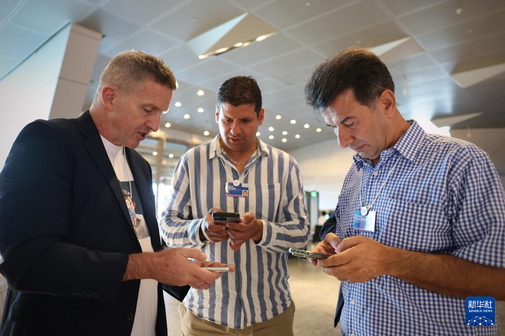 6月26日,三位嘉宾在夏季达沃斯论坛主会场大连国际会议中心内分享联系方式。新华社记者 姚剑锋 摄