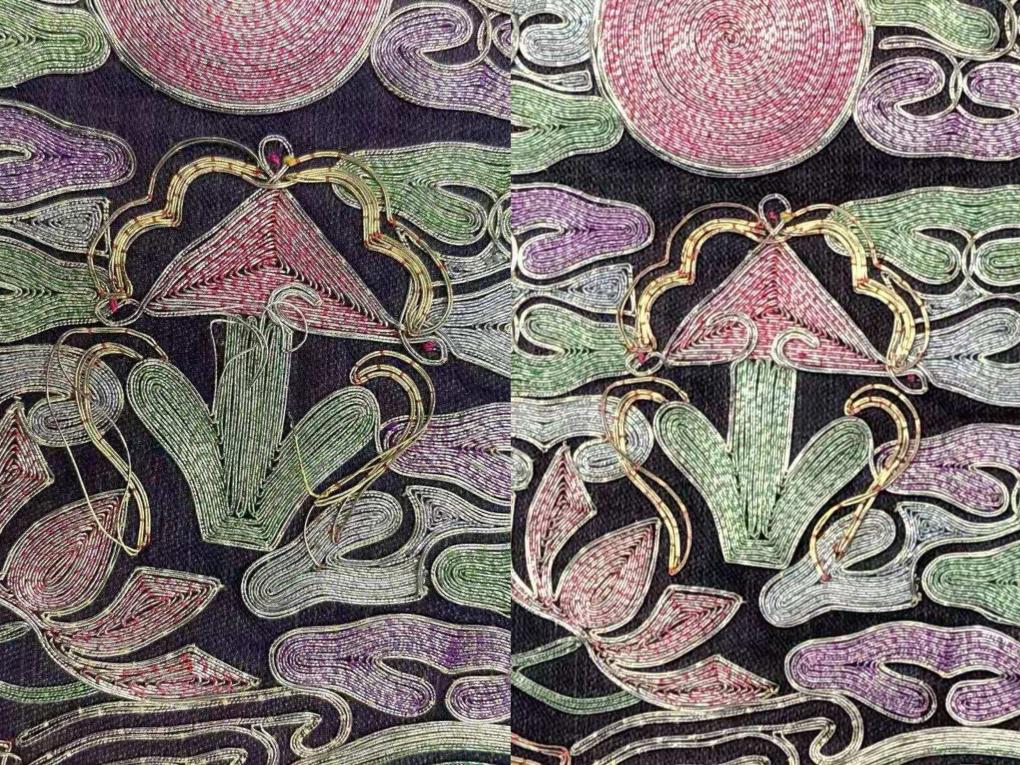 展览中展出的“清蓝缎平金龙铜钉棉甲”吸引了不少观众的目光。张莹说:“这件棉甲由金钮扣袢联缀成一整体,为乾隆帝御用大阅甲。修复重点为盘金绣复原,即将金线、银线盘成图案,再用绣线将其钉缝固定于面料上。在修复时,使用钉线法进行金线复位及固定,同时在缺失的部位补充金线,有效解决盘金线脱落等病害问题。”