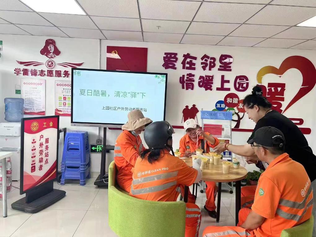 6月至8月,大东区总工会以“工会驿站”为阵地,结合广大户外劳动者的迫切需求,开展“夏日享清凉”关爱户外劳动者主题慰问活动。在活动期间全区62家工会驿站对户外劳动者不仅提供饮水、就餐、纳凉等服务项目,还免费为前来驿站休息的环卫工人、快递员、外卖员、交警等户外劳动者提供冰豆浆、绿豆汤等解暑饮品。解暑饮品当天制作当天发放,让每一位户外劳动者喝得“舒心”喝得“放心”,感谢他们在烈日炎炎下仍坚守在一线辛勤劳动,为他们送去一份清凉,送去一份问候,从而有效提升广大户外劳动者的认同感、归属感和幸福感。