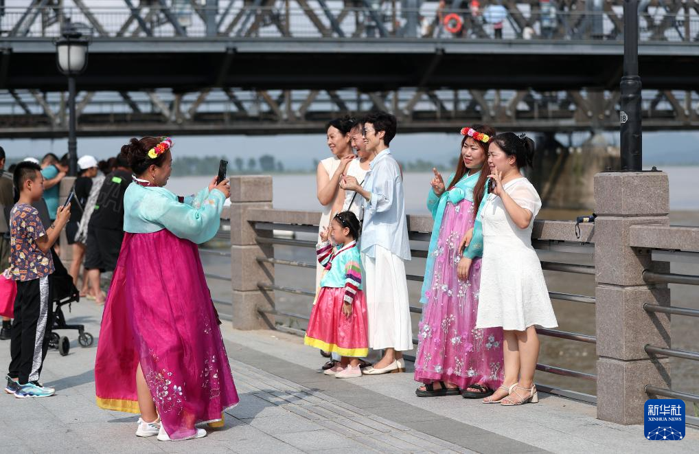 8月2日,游客在鸭绿江畔游览。新华社记者 龙雷 摄