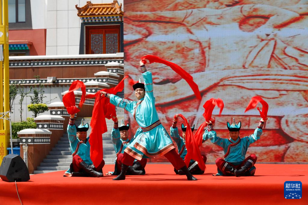 这是8月2日在辽宁省阜新蒙古族自治县查干哈达村第216届睦邻节上拍摄的歌舞表演。