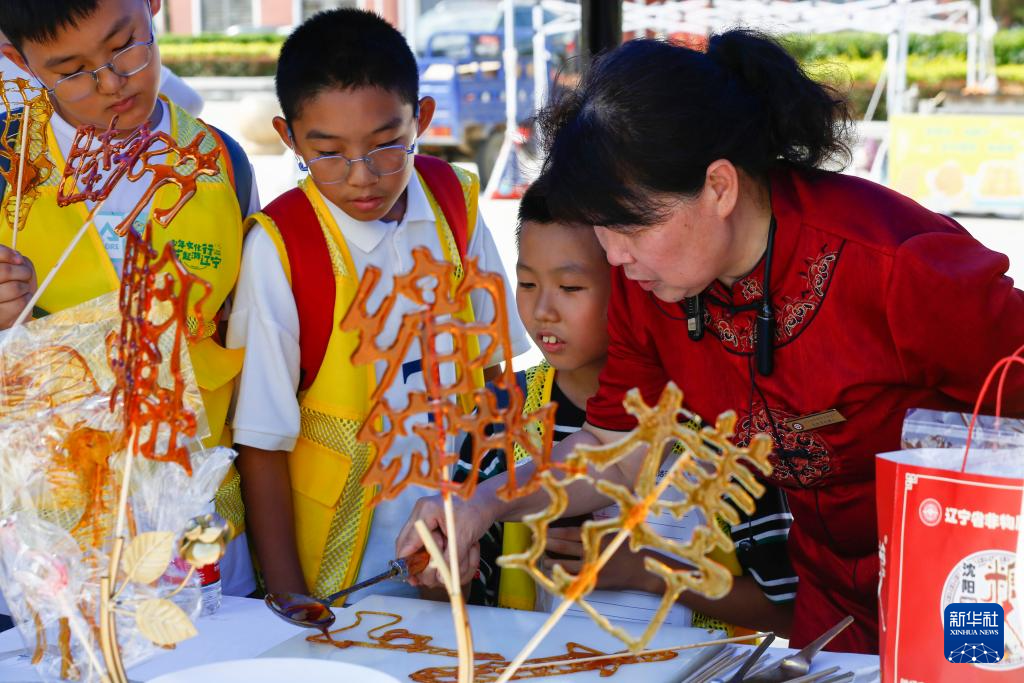 8月2日,小朋友辽宁省阜新蒙古族自治县查干哈达村第216届睦邻节上体验传统非遗项目。