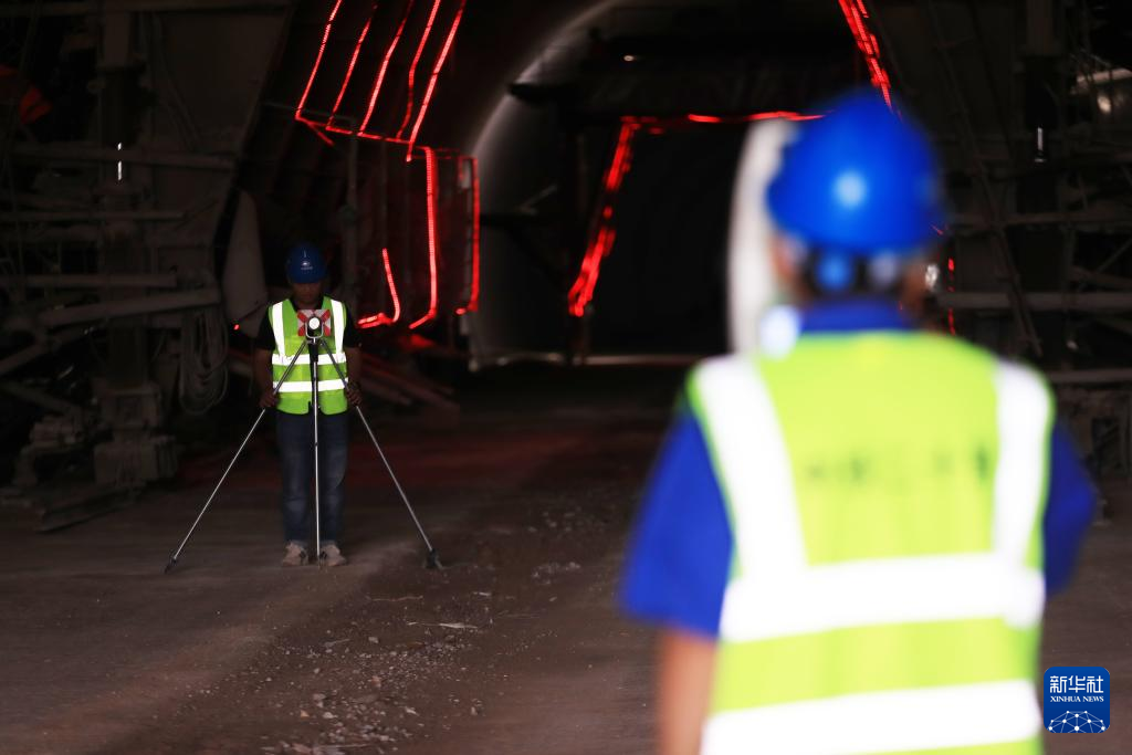 8月13日,中铁二十局建设者在隧道内进行中线复核测量。