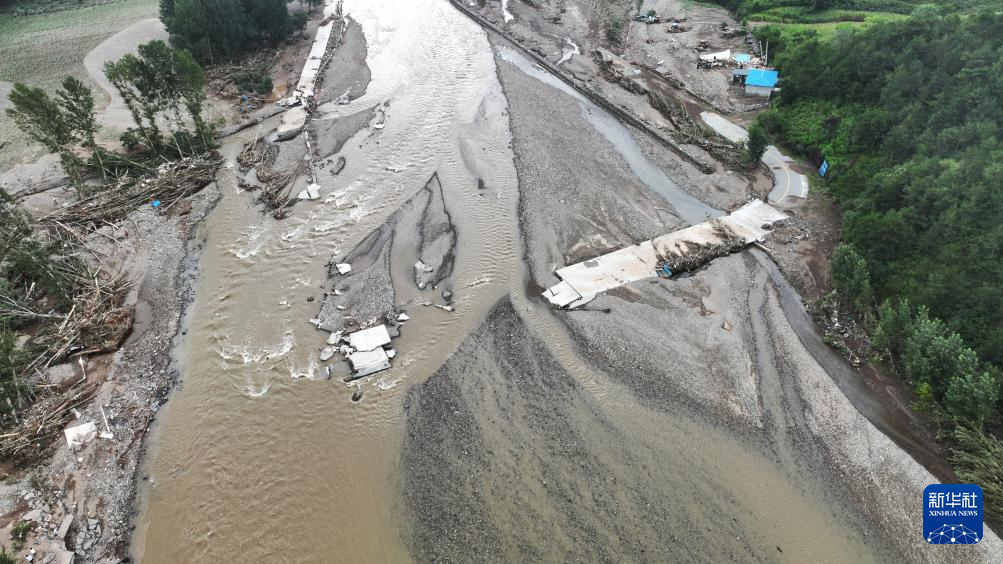 8月21日,在建昌县黑山科乡,一条河流上的桥梁被冲毁(无人机照片)。新华社记者 杨青 摄