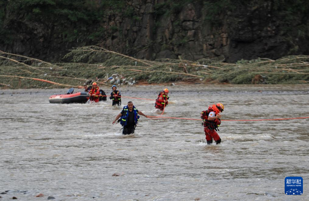 8月21日,在建昌县黑山科乡,来自山东的救援队伍给对岸受灾群众送去医疗物资后渡河返回。新华社记者 杨青 摄pagebreak
