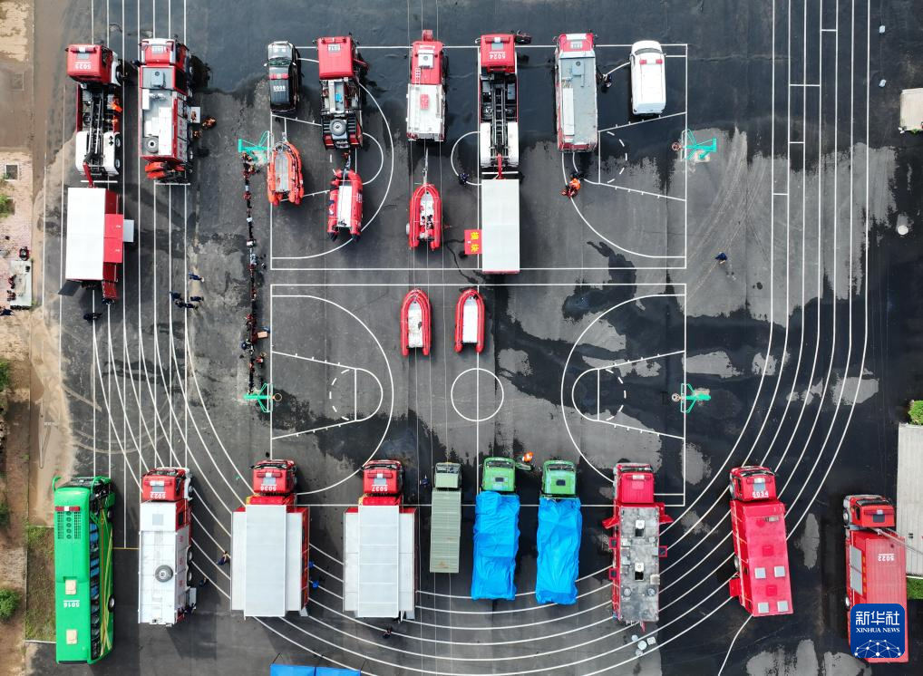 8月21日在建昌县黑山科乡初级中学拍摄的各方救援车辆(无人机照片)。新华社记者 杨青 摄pagebreak