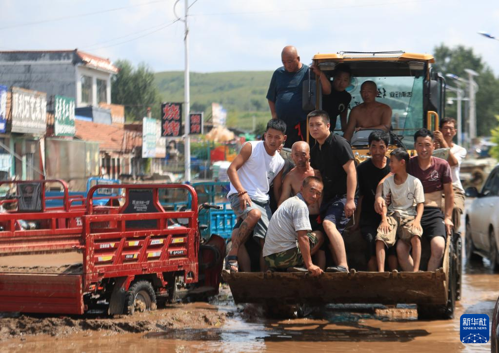 8月21日,在建昌县黑山科乡,受灾居民乘铲车进行转移。新华社记者 杨青 摄