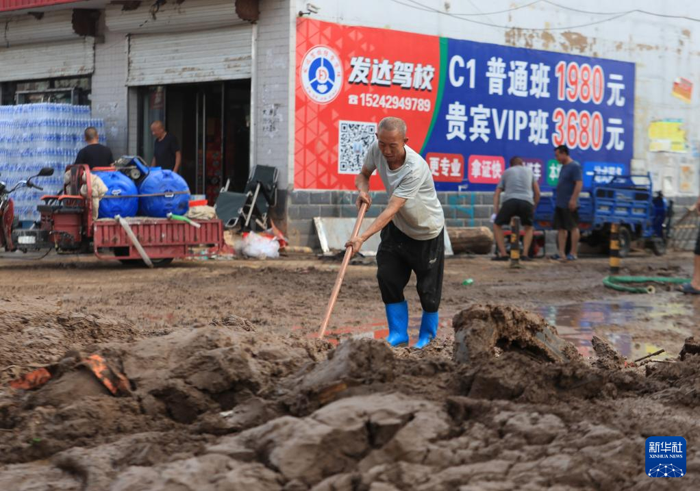 8月21日,在建昌县黑山科乡,一名居民在清理道路淤泥。新华社记者 杨青 摄pagebreak
