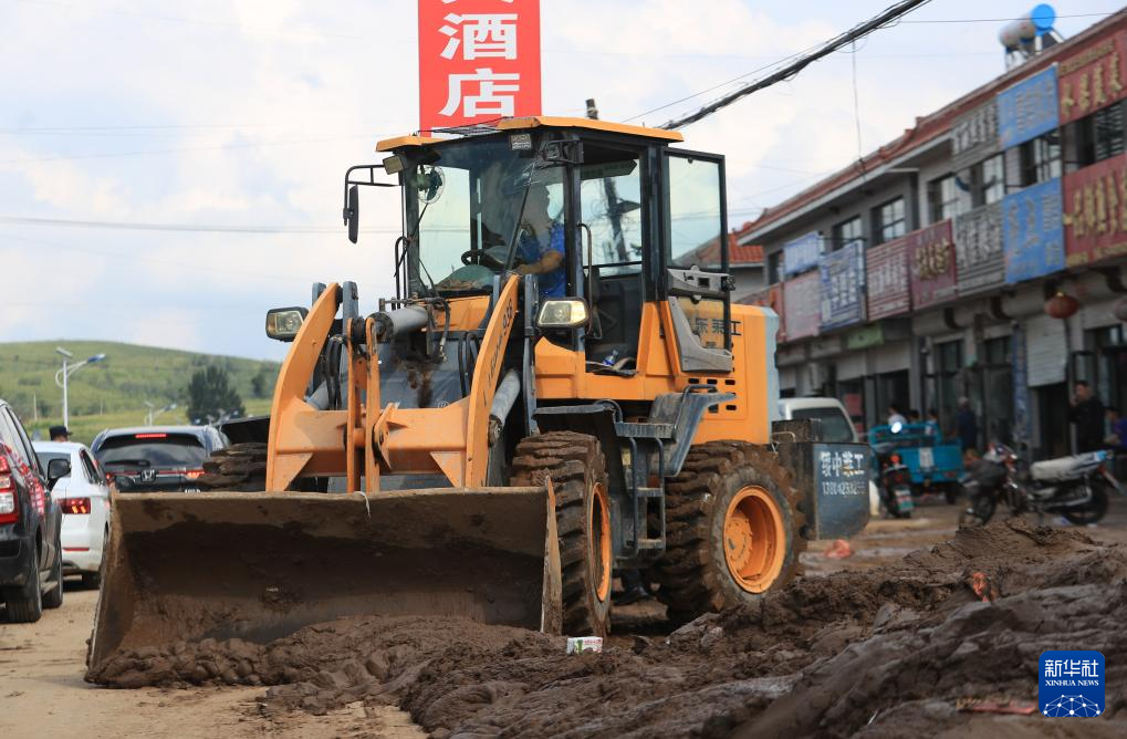 8月21日,在建昌县黑山科乡,救援车辆在清理道路淤泥。新华社记者 杨青 摄pagebreak