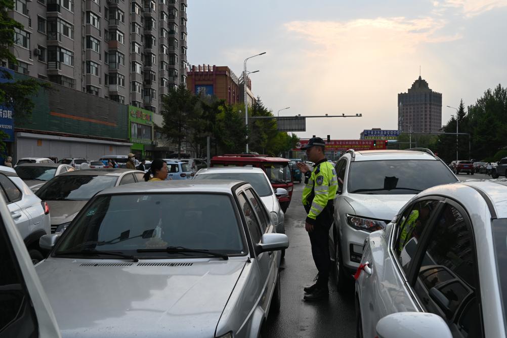 开原市公安交通警察大队的交警正在疏导校园周边的车辆。(开原市纪委监委供图)