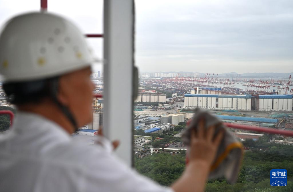 9月10日,王洪安在擦拭台子山灯塔顶部灯器室玻璃上的灰尘,远处是营口港。