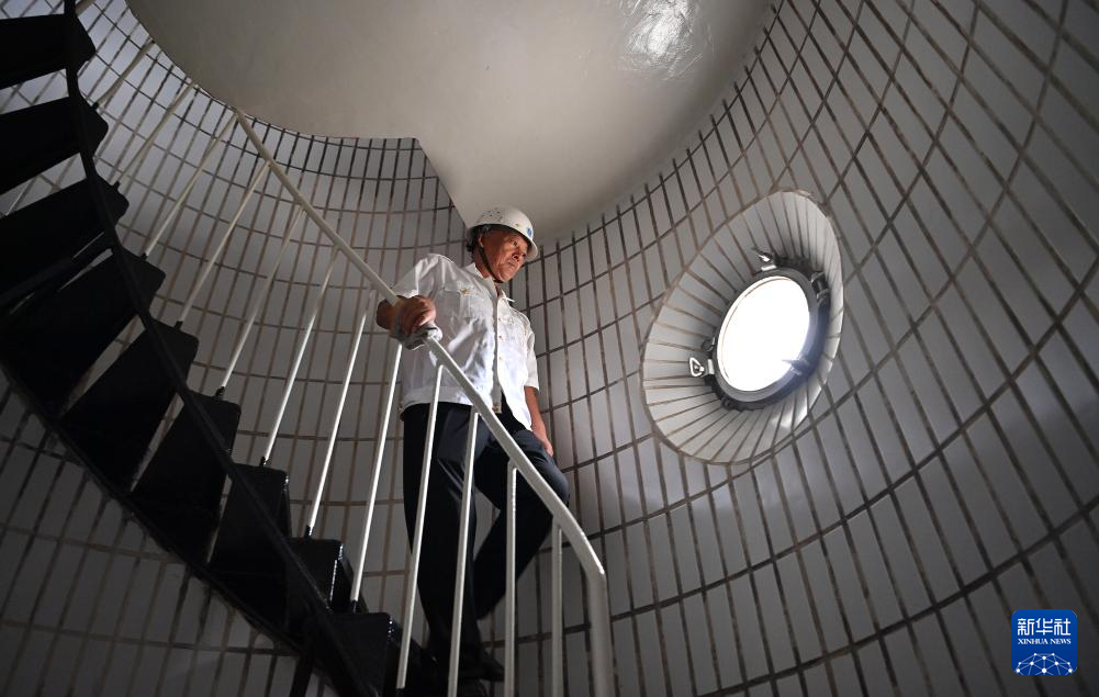 9月10日,王洪安在灯塔顶部检查灯器工作状态后,从七层楼高的旋转楼梯走下。