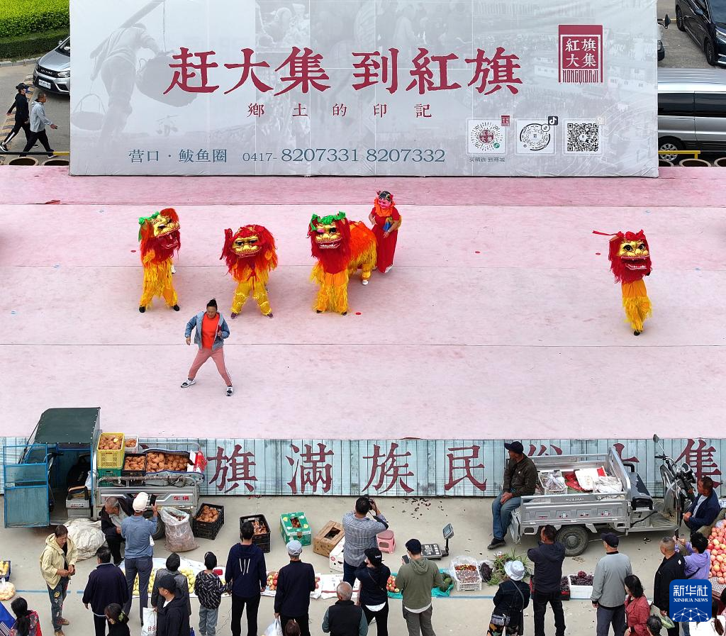 9月15日,演员在红旗大集的舞台上舞狮(无人机照片)。