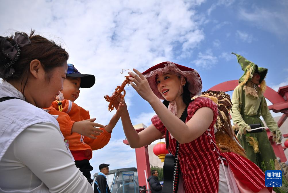 9月15日,上海乌龙剧团的演员在红旗大集上和小朋友互动。