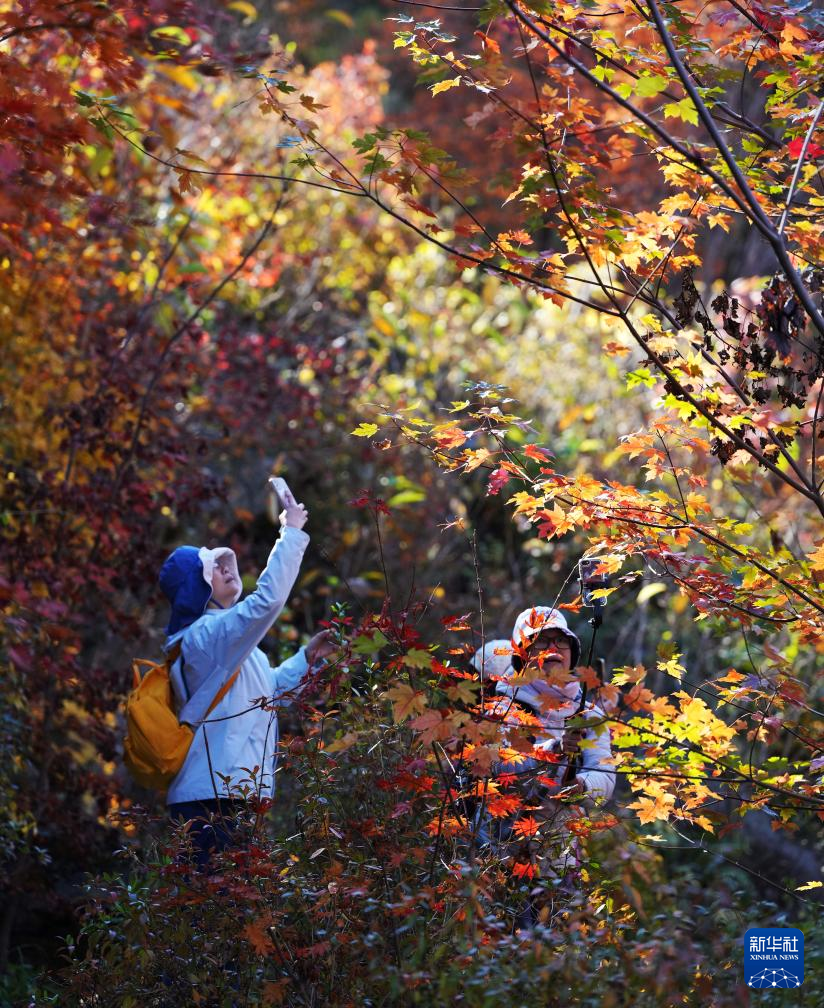 10月16日,在辽宁本溪的老边沟风景区,游客拍照留念。