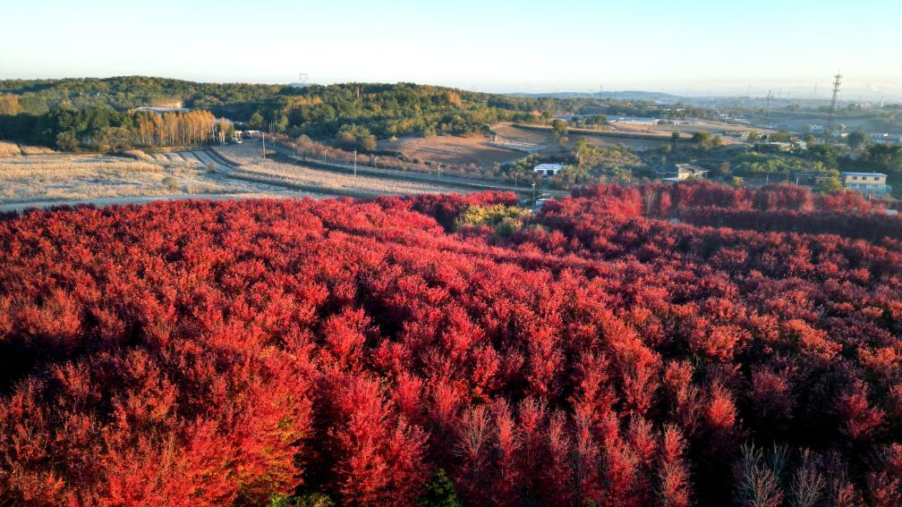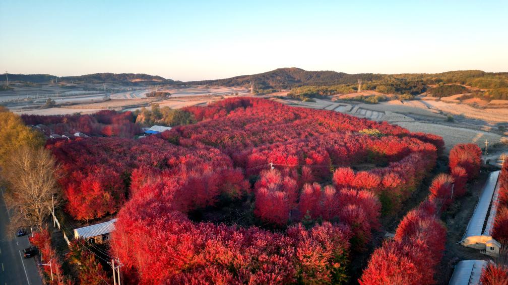 ↑2024年10月16日拍摄的辽宁省沈阳市浑南区王滨街道富家屯村红枫林秋景。(无人机照片)CICPHOTO/黄金崑 摄
