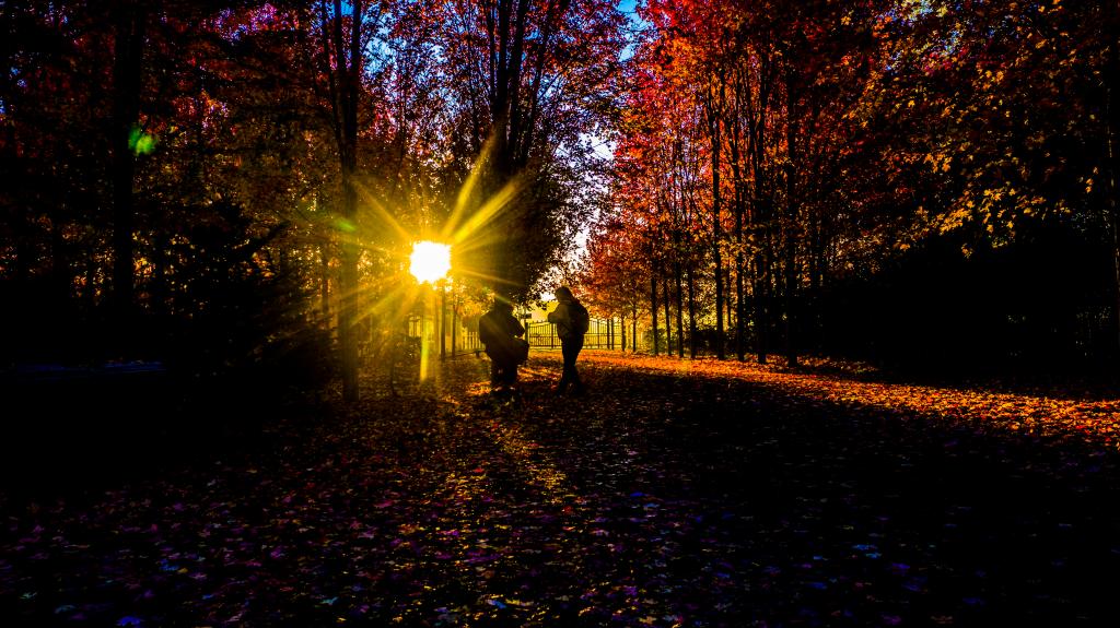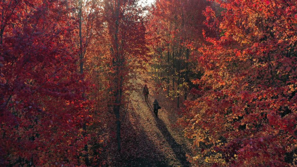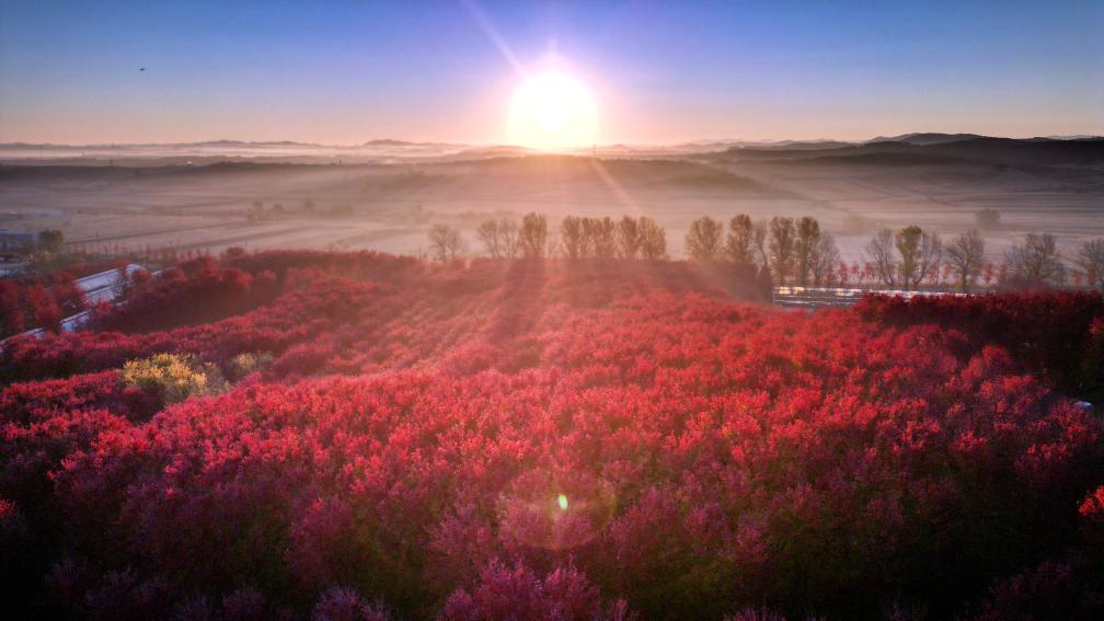 辽宁省沈阳市浑南区秋意渐浓,枫林连成一片火红的秋海,在晨光里显得耀眼夺目,吸引游人徜徉其中。