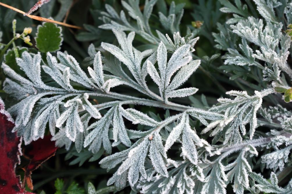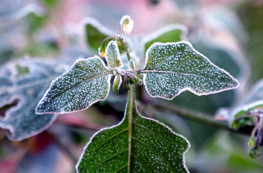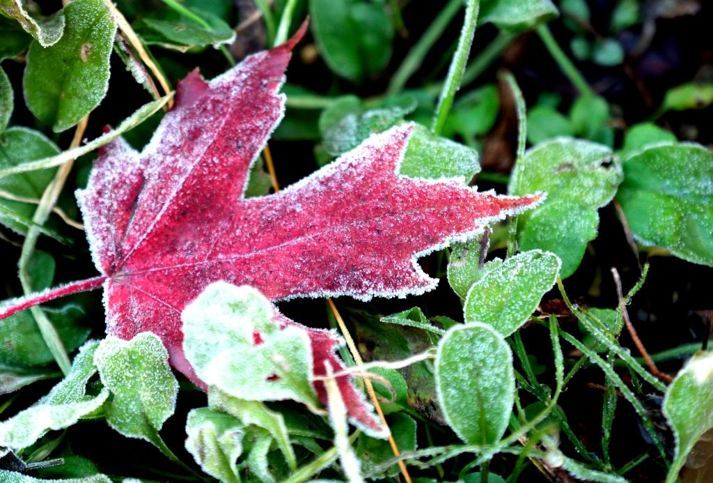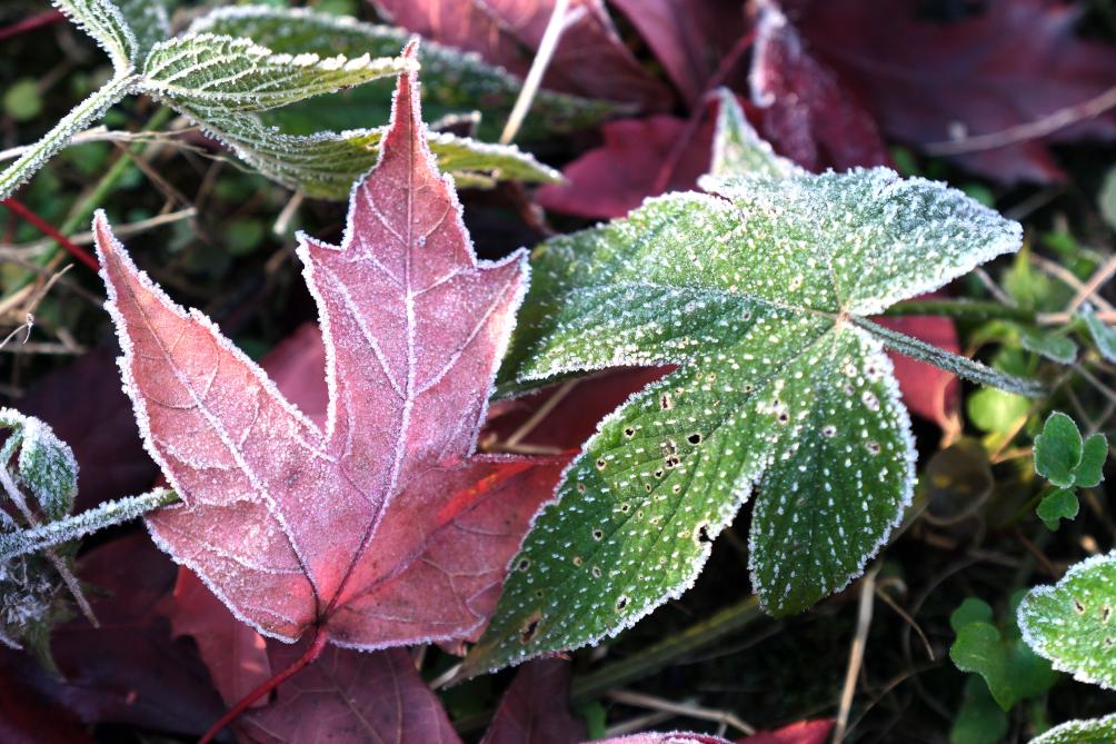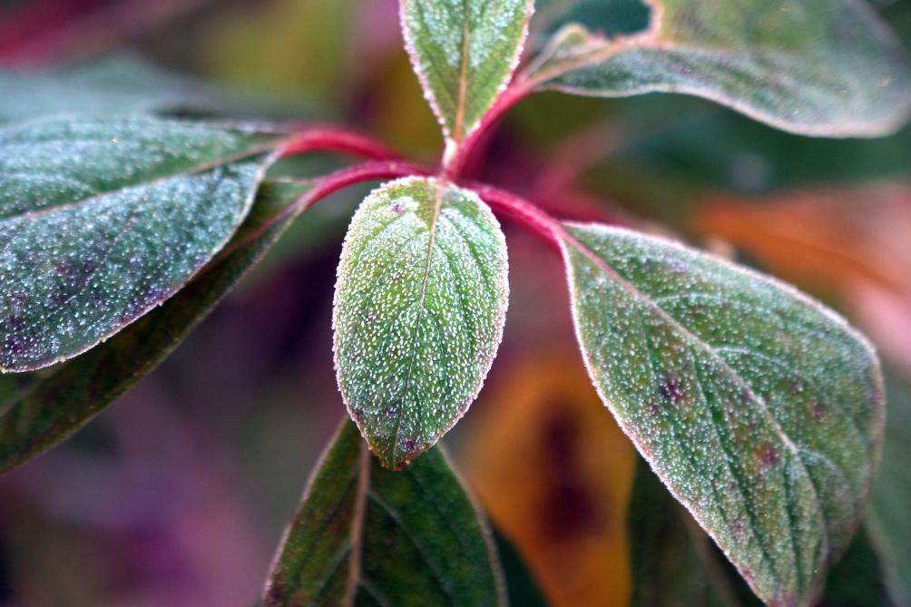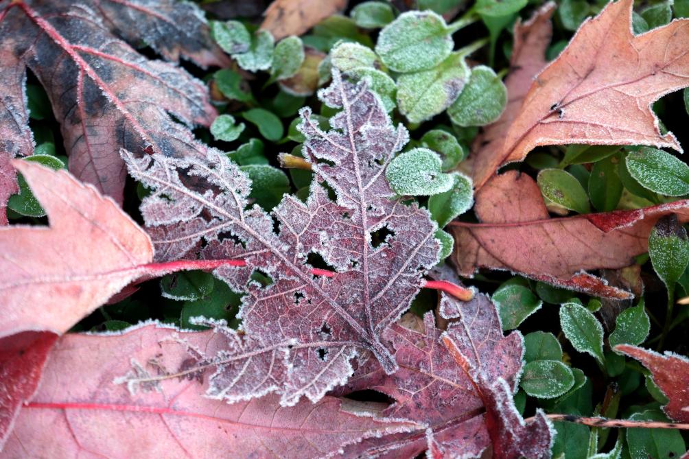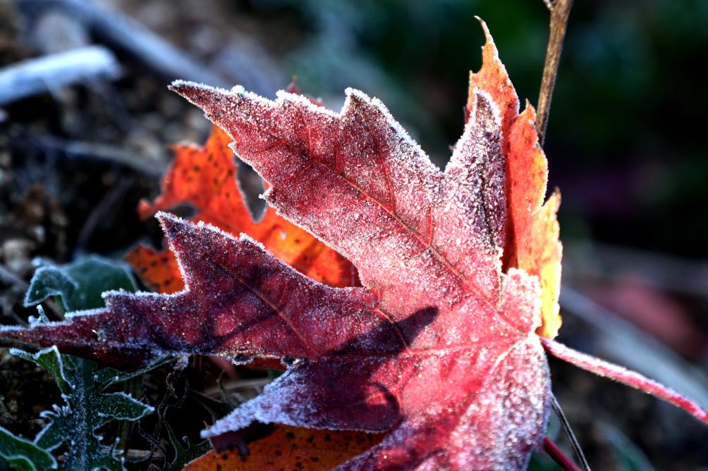 深秋时节,植物上凝结了一层雪白的霜花。五彩缤纷的草木和落叶被装扮得晶莹剔透,尽显玲珑可爱。