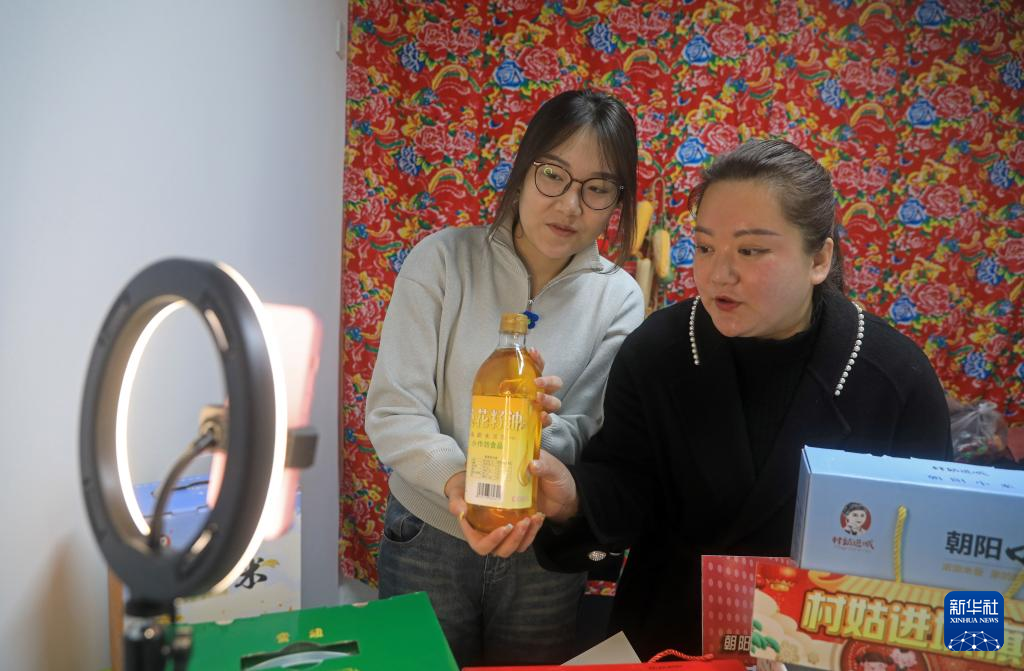 王颖(右)和大学生一起直播卖货。新华社记者杨青 摄