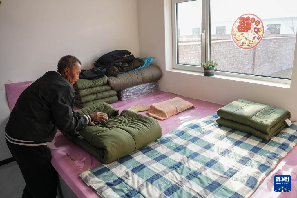11月8日,辽宁省葫芦岛市绥中县祝家沟村村民在集中安置重建住房内整理被褥。