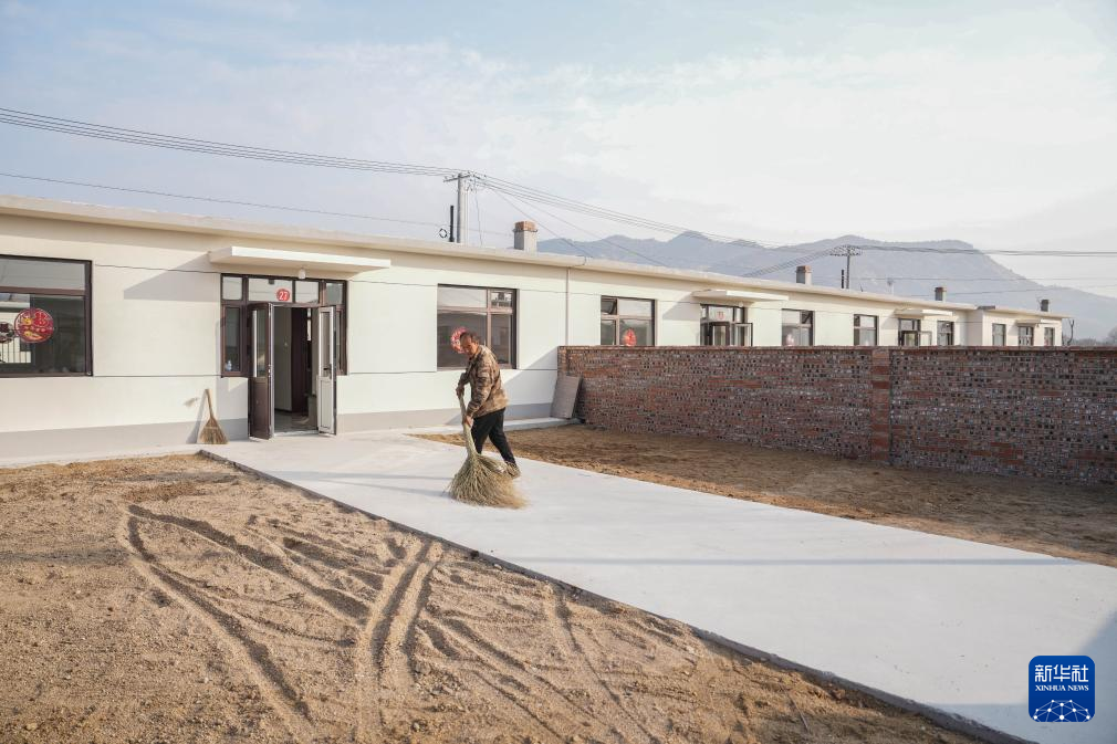 11月8日,辽宁省葫芦岛市绥中县祝家沟村村民在集中安置重建住房清扫院子。