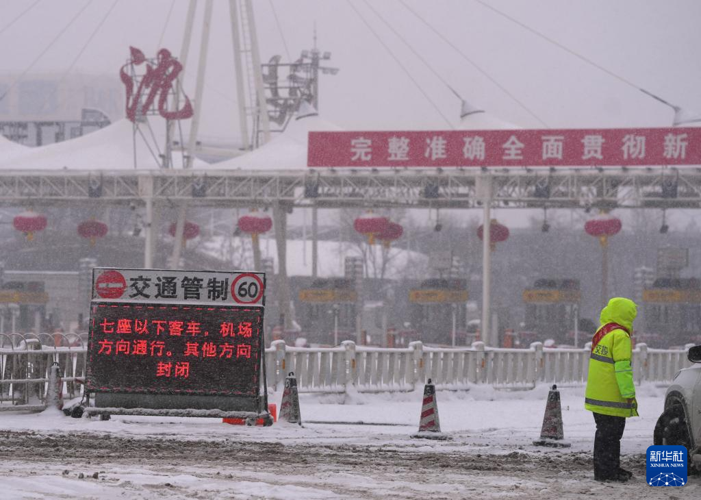 1月27日,受降雪影响,沈阳一高速公路入口进行交通管制。
