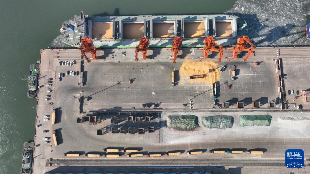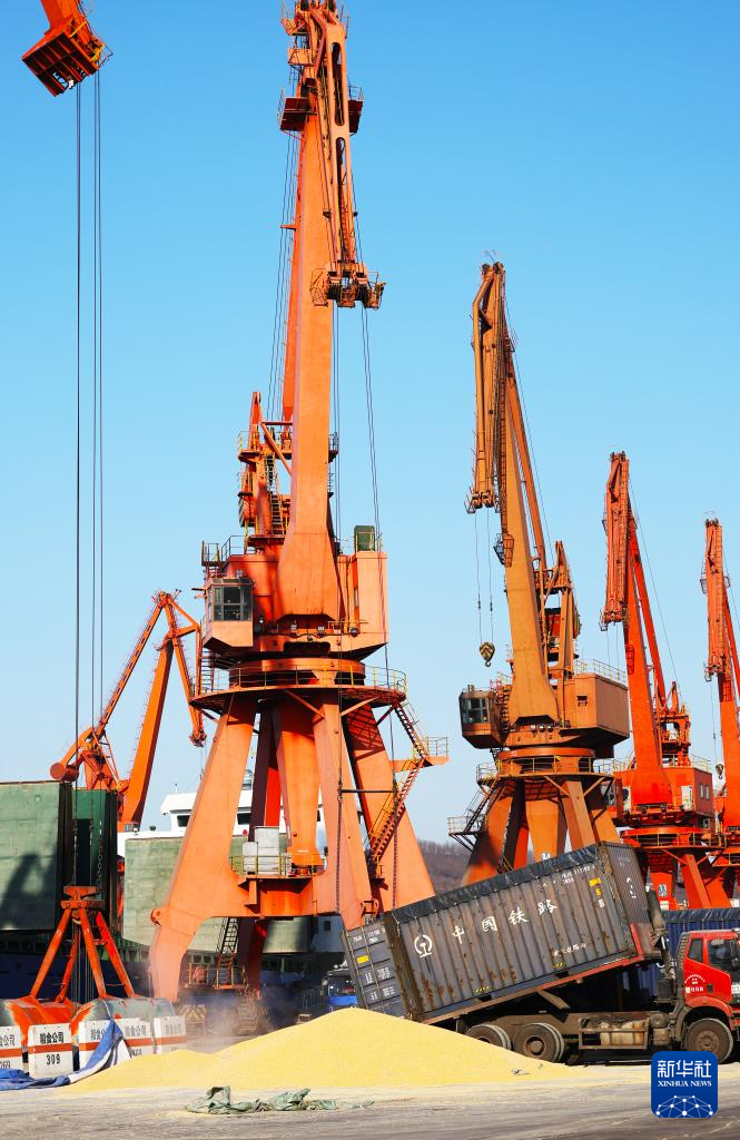 2月18日,在营口港鲅鱼圈港区,装满玉米的敞顶箱在码头卸货。