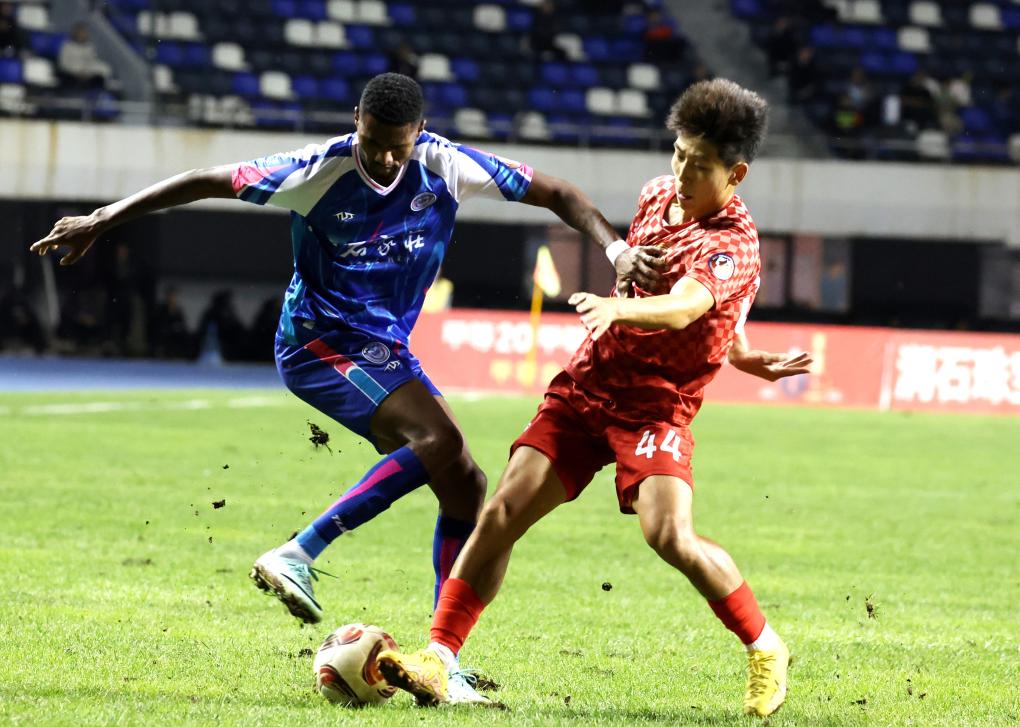 2024年9月22日,辽宁铁人队球员陈永泽(右)与石家庄功夫队球员阿约维在2024赛季中国足球协会甲级联赛第24轮比赛中拼抢。新华社发(张晓峰 摄)