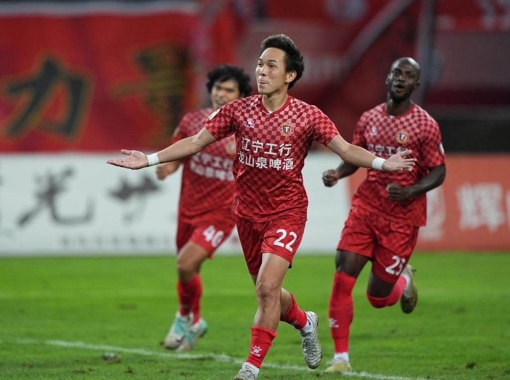 2024年9月1日,辽宁铁人队球员邦本宜裕在2024赛季中国足球协会甲级联赛第21轮比赛中庆祝进球。新华社记者 李钢 摄
