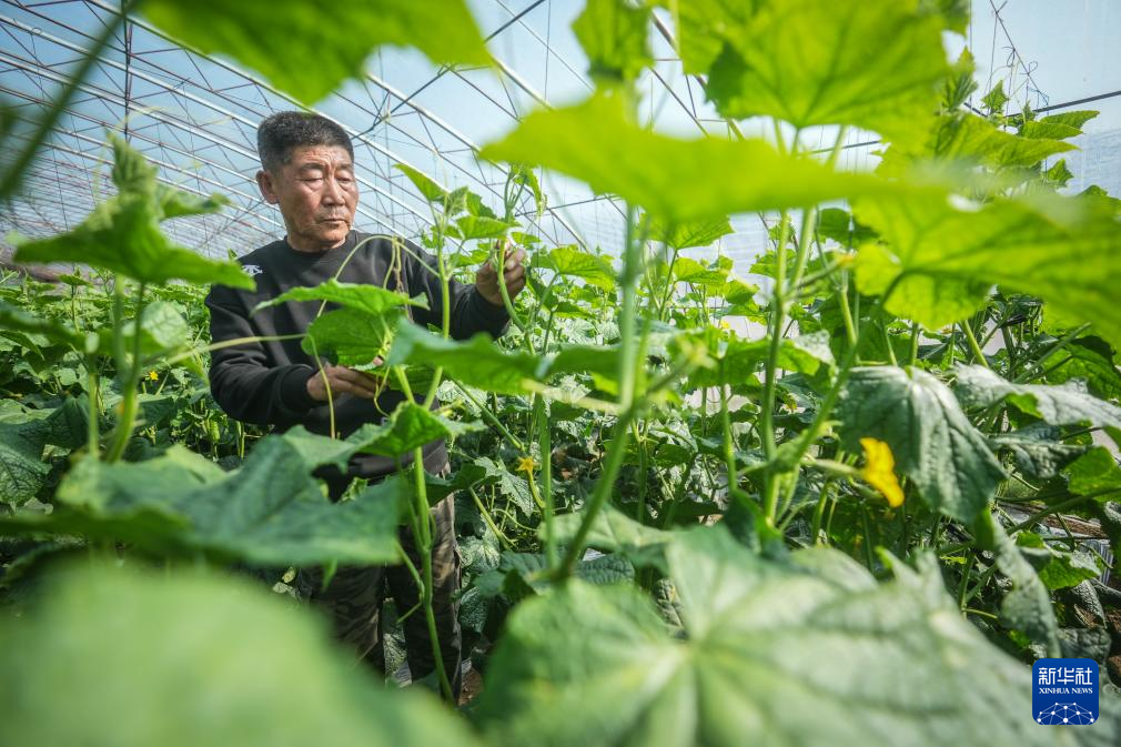 3月6日,在辽宁省葫芦岛市绥中县,种植户在黄瓜种植大棚查看黄瓜长势。