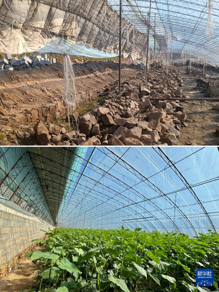 拼版照片:上图为2024年8月30日在辽宁省葫芦岛市绥中县拍摄的被洪水冲毁的黄瓜大棚(新华社发);下图为2025年3月6日在绥中县拍摄的灾后重新修建的黄瓜大棚(新华社记者 吴青昊 摄)。