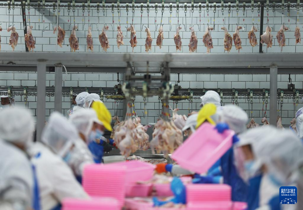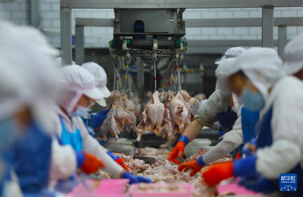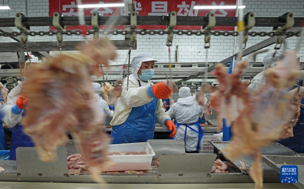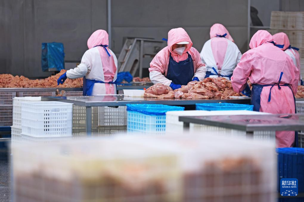 3月11日,在鞍山丰盛食品有限公司,工人在车间加工处理鸡肉。新华社记者 杨青 摄