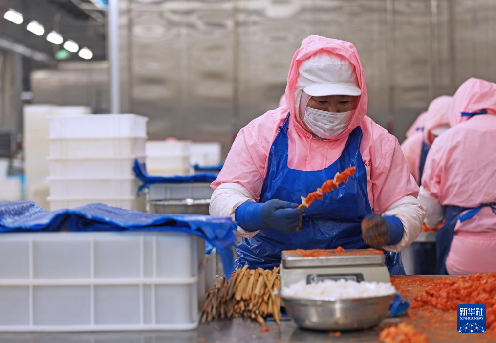 3月11日,在鞍山丰盛食品有限公司,工人在车间加工处理鸡肉串。新华社记者 杨青 摄