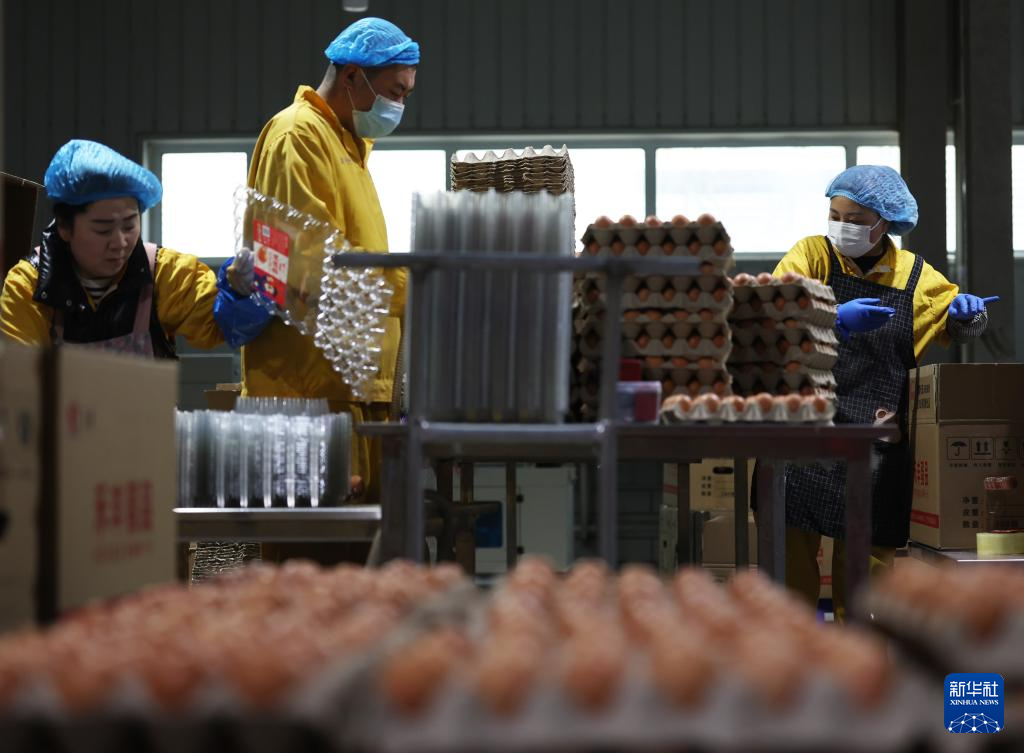 3月11日,在辽宁禾丰蛋业有限公司,工人在车间给生鲜鸡蛋打包装箱。新华社记者 杨青 摄