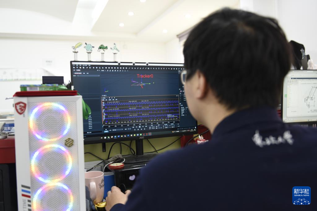 3月18日,储逸尘在沈阳粼动仿生科技有限公司内监测水下仿生机器人运动轨迹。新华社记者 吴青昊 摄
