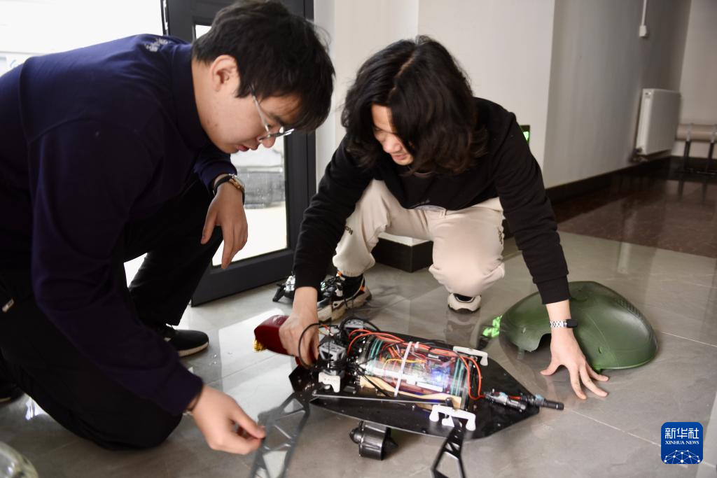 3月18日,储逸尘(左)和同事在沈阳粼动仿生科技有限公司内组装两栖仿生海龟机器人。