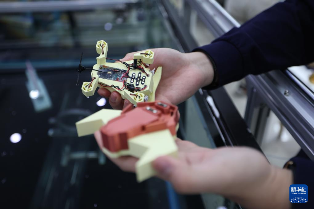 3月18日,储逸尘在沈阳粼动仿生科技有限公司内展示水下仿生机器人。新华社记者 杨青 摄