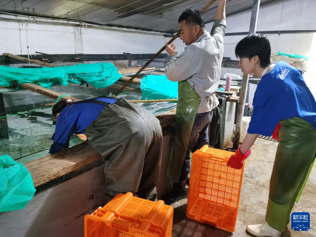 在大连一家渔业养殖场内,沈阳粼动仿生科技有限公司工作人员放置两栖仿生海龟机器人(2024年5月3日摄)。新华社发