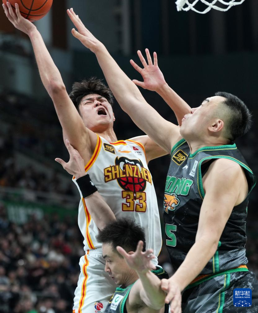 3月19日,深圳马可波罗队球员王浩然(左)在比赛中上篮。新华社记者 李钢 摄