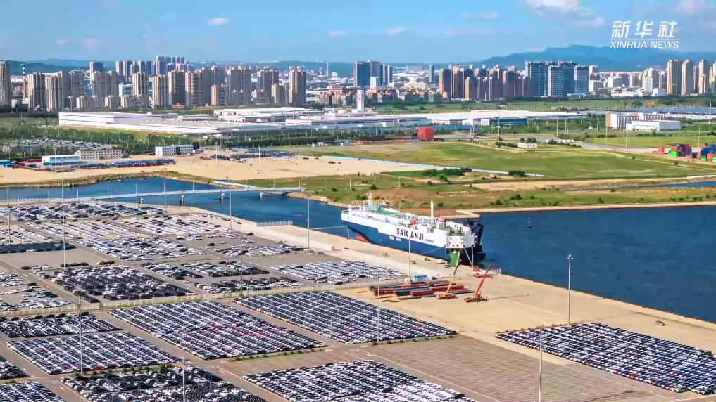 碧海蓝天之下,在大连汽车码头堆场,数以万计的全新商品车整齐排放。在操作人员指挥下,商品车鱼贯驶入汽车滚装运输船中。